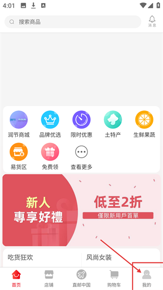 1、在【拍拍猫商城】首页可使用搜索栏,还有【润节商城】-【品牌优选】等功能入口,底部点击【我的】进入个人中心页面。