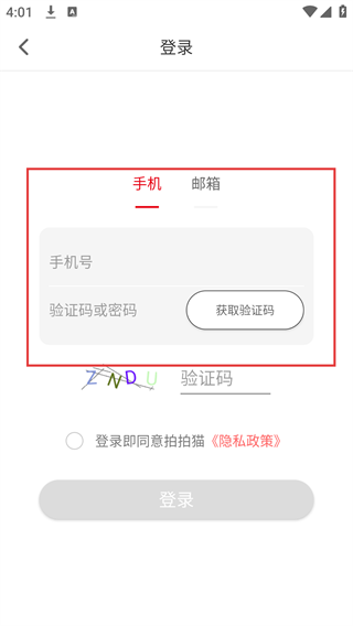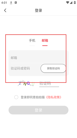 4、切换到【邮箱】登录选项,填写【邮箱】,点【获取验证码】后填【验证码或密码】,完成登录相关操作。