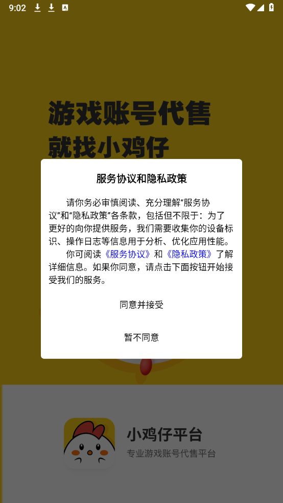 1、安装小鸡仔代售应用,在同意相关政策与协议后将其打开。