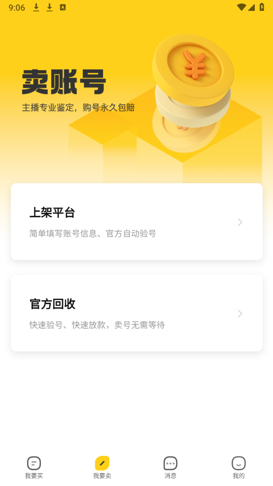 4、点击“我要卖”板块,填写账号相关信息,等平台审核通过后就能发布了。