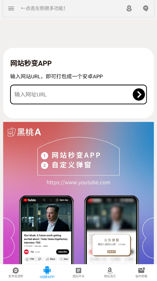 5、点击“H5转”功能,输入网址URL即可打包成一个安卓应用。