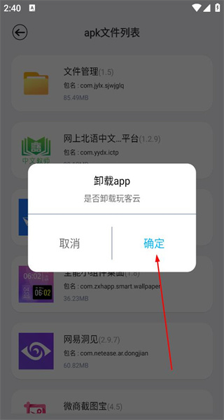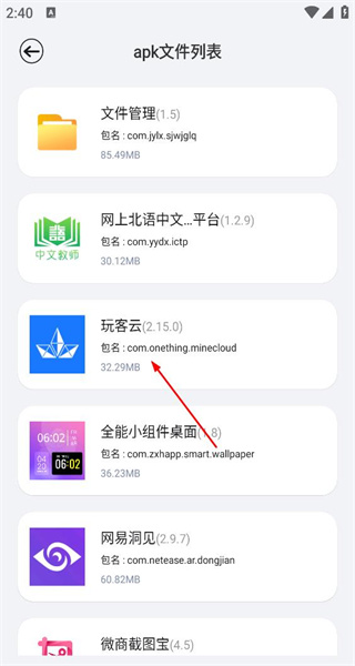 2、在apk文件列表页面,浏览展示的应用条目,找到玩客云应用并点击,调出该应用的操作功能菜单。
