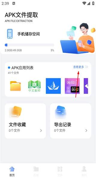 1、打开软件首页,查看手机存储空间占用情况,点击APK应用列表旁的查看更多,进入apk文件列表页面。