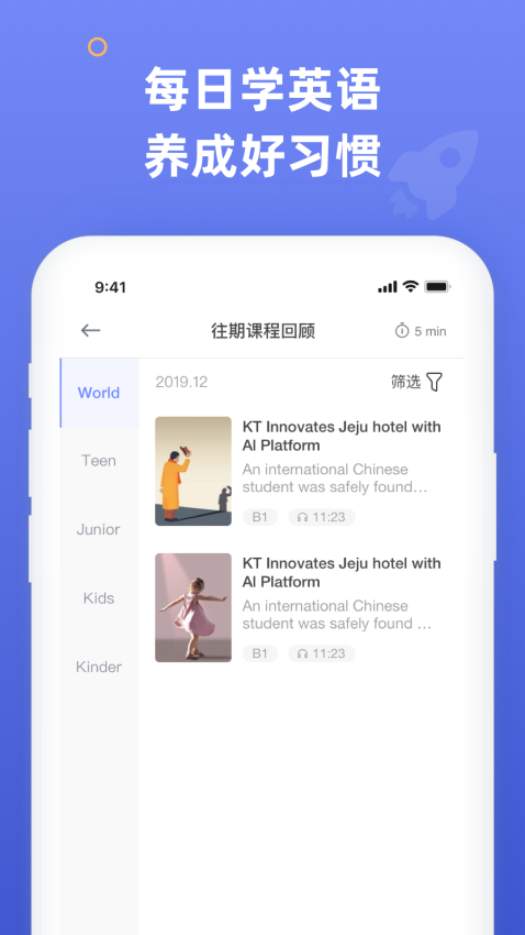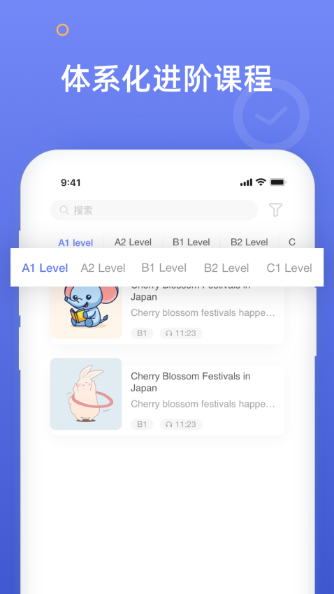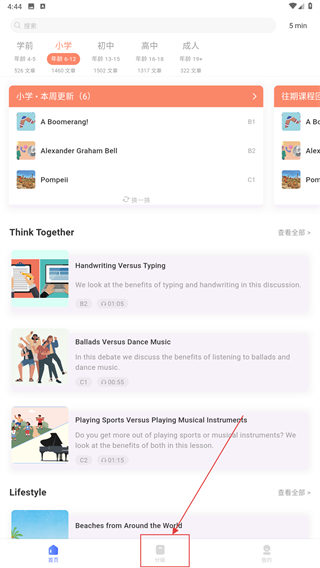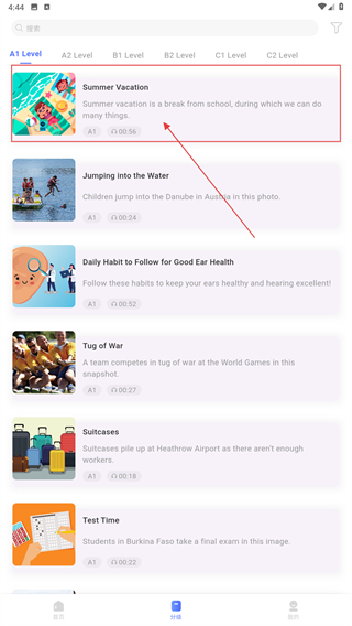 1、在首页点击底部【分级】选项,进入按语言水平分类的课程列表页面,可选择对应难度的学习内容。