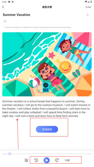 3、在课程详情页,可播放音频、调整语速,阅读内容后点击【完成阅读】标记学习进度。