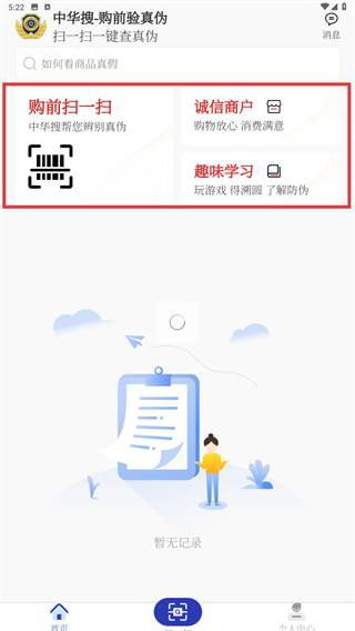 进入主界面后,可借助【购前扫一扫】功能(扫码入口)完成商品真伪查验,还能使用【诚信商户】【趣味学习】等辅助功能。