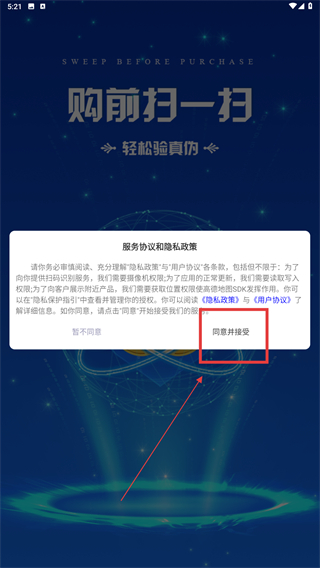 2、仔细阅读《服务协议和隐私政策》的内容后,点击“同意并接受”按钮,即可完成权限与协议的确认流程。