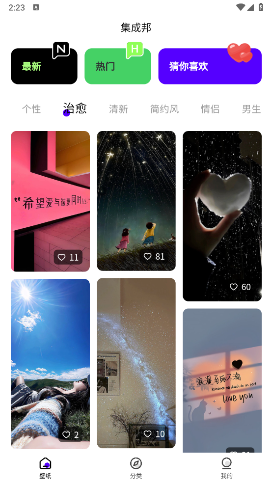 3、在“分类”页面中,有很多的不同壁纸以及头像分类。