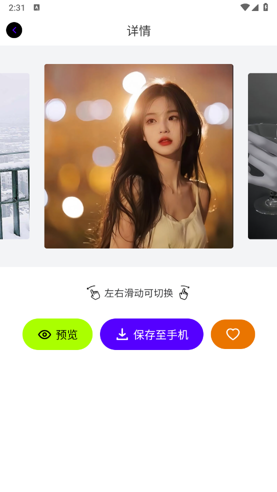 4、选择喜欢的壁纸或者头像,可以进行预览、收藏以及保存到手机,上下滑动即可切换下一张。