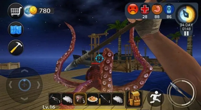 在海上冒险时,玩家会遭遇鲨鱼、章鱼等各类海洋生物的威胁。为了应对这些危险,玩家需要通过收集资源来打造长矛、弓箭等武器——这些武器既能帮助抵御敌人的攻击,也可用于捕捉海洋生物以获取食物。