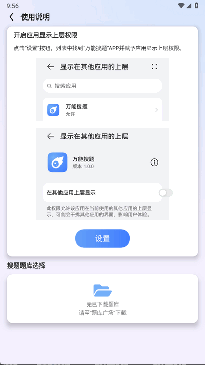 万能搜题答题软件是一款汇聚海量题库的学习工具,致力于为用户打造高效的学习与备考环境。该平台覆盖多行业题库资源,用户可依据自身学习需求,自由挑选对应题目开展练习与测试。其核心功能涵盖拍照搜题、极速搜题、读屏搜题等多种模式,借助不同途径快速获取答案,显著增强了学习的灵活性与便捷性。此外,软件还设有题库广场功能,方便用户轻松查找所需题库,进一步拓展了学习资源的广度。