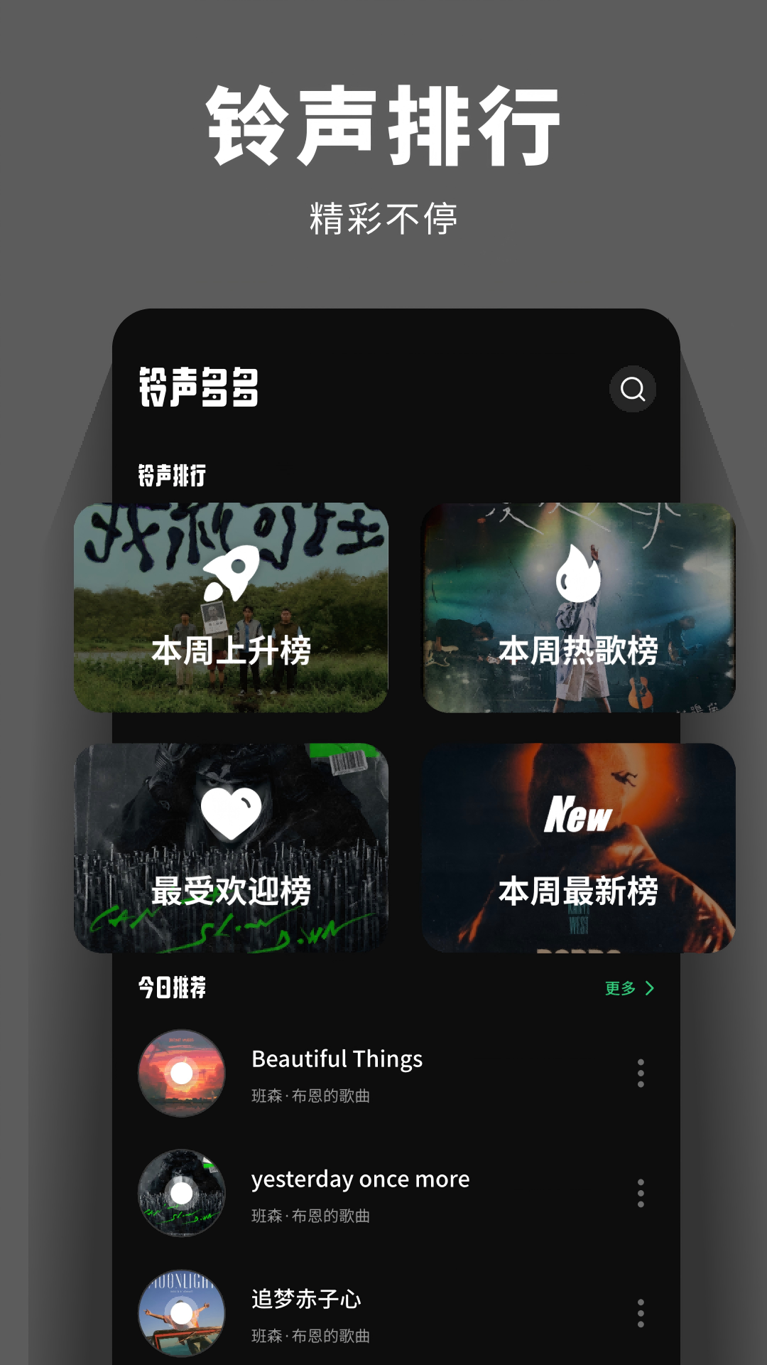 与潮流同步,及时更新曲库,保证用户总能拥有最新鲜、最流行的铃声选择,走在时尚前沿。