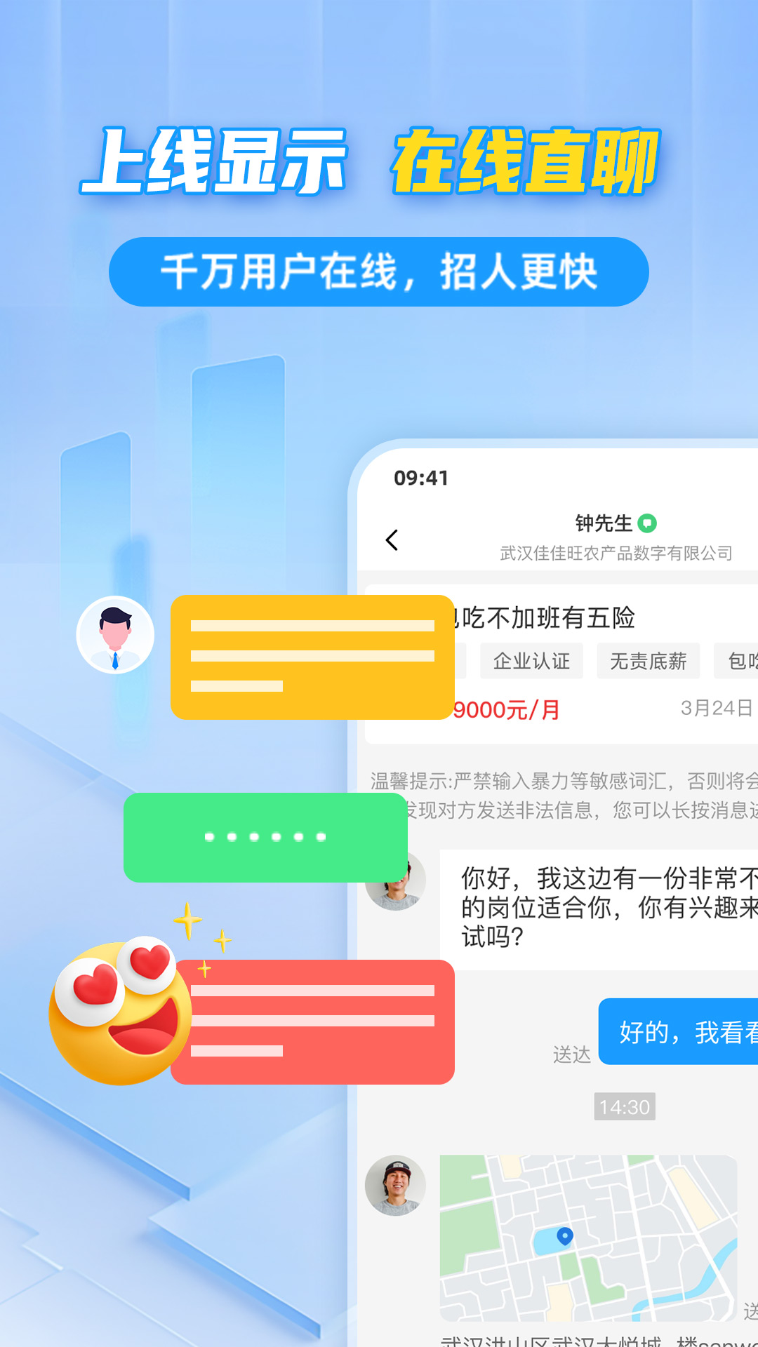3.在线沟通:求职者与企业可实时在线聊天,快速沟通工作内容、加班情况及岗位福利,极大缩短了求职和招聘的时间。