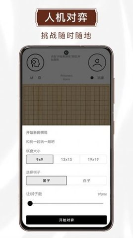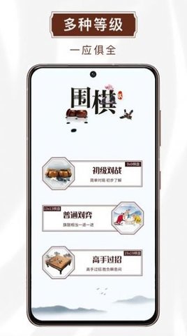 包含初级对战(9×9棋盘)、普通对弈(13×13棋盘)、高手对招(19×19棋盘)等功能。用户能够与人机在线对弈,尽情享受下围棋的乐趣。