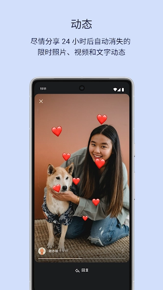 用户可以自主发布动态,该动态支持24小时后自动消失,并且兼容文字、图片和视频等多种形式,通过个性化的内容呈现,满足用户表达心情的需求。此外,这里还能作为个人私密空间,仅与亲密好友进行交流,能有效保障用户的隐私安全。