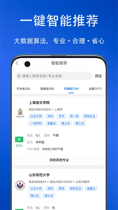 精准数据填报服务:只需1秒钟,就能为你快速匹配出可报考的院校,并提供个性化的智能推荐。