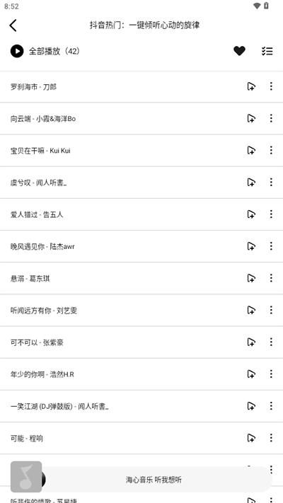 海心音乐免费版【02-20更新】是一款专注于音乐播放和发现的移动应用,提供丰富的正版音乐资源,涵盖流行、摇滚、古典、电子、爵士等多种音乐类型,适合音乐爱好者日常消遣和娱乐,为用户提供高质量的音乐体验。海心音乐2025最新v1.0汇集海量音乐资源,涵盖全球最新、最热门的歌曲,国内外歌手应有尽有,提供运动歌单,适合跑步、健身时收听,喜欢听歌的朋友快来。