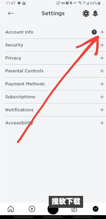 3.点击进入设置界面后,点击第一个“account info(账户信息)”右侧的箭头