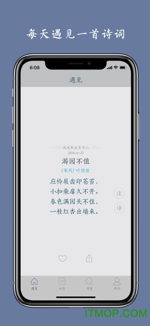 系统每日会自动推送一首诗或词,仅一首,不会过量,过多会让人感到无所适从。这一首,也不会占用你太多时间,读一遍,感受一下诗人的文辞与情感,为忙碌的生活增添一份静谧。