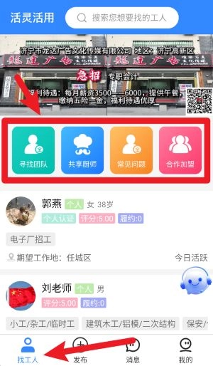 若选择工人身份,可通过首页的寻找团队、共享厨师等模块,快速进入对应的目标功能区域。