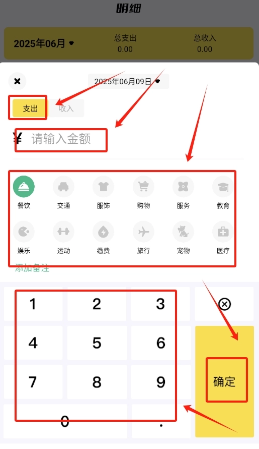 点击首页的快捷记录按钮,输入收支金额后选择对应的分类标签,即可完成账目记录。