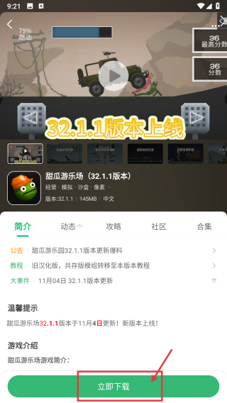 3、于沙盒游戏界面,挑选甜瓜游乐场32.1.1版本的游戏,进而进入游戏详情界面。