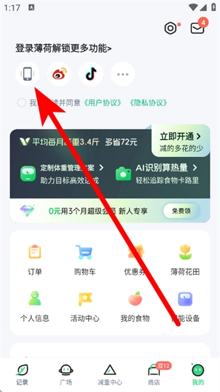 1、打开薄荷健康,点击底部我的,进入个人页面。