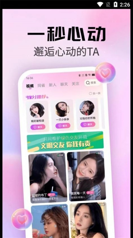 粉遇视频聊天是2023年上线的手机视频聊天交友应用,平台上汇聚了来自全国各地的单身用户。在这里,用户能够畅所欲言地表达个人观点,分享真实的内心感受。2025最新版的粉遇聊天交友,支持用户与志同道合的伙伴交流情绪,大家可以自由选择心仪的交友模式,实现边互动边结识朋友的轻松体验,告别枯燥乏味,收获满满的社交乐趣。喜爱聊天交友的朋友们,不妨来试试吧!