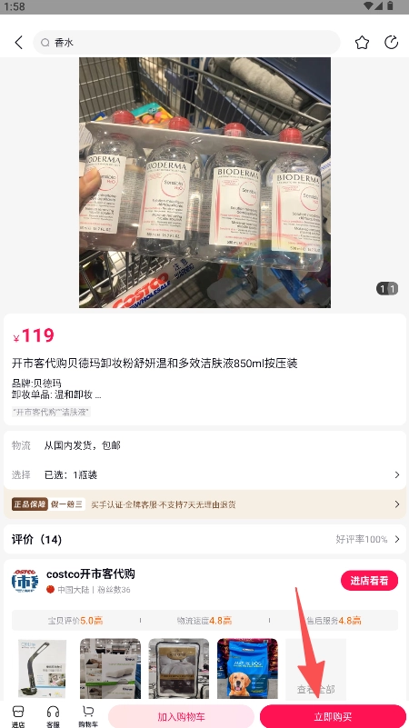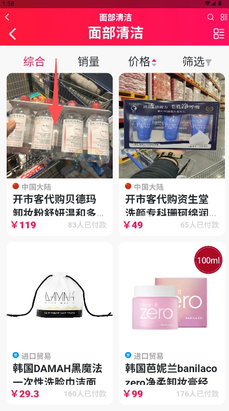 2、进入页面筛选商品列表,点击目标商品(如贝德玛卸妆水)进入详情页。