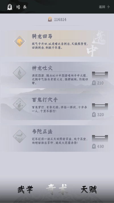 培养系统:点击“培养”按钮,会消耗金币来解锁新的奇术与武学,同时也能对天赋进行升级操作。