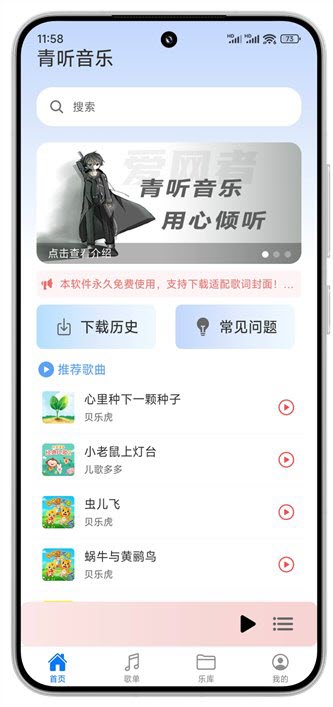 青听音乐2025最新版【02-22更新】是一款免费音乐软件,提供丰富的音乐资源,涵盖流行、古典、摇滚、电子等,无论是全球流行金曲还是独立小众音乐,都能在其中找到。青听音乐V1.0.3无需登录,没有广告,支持在线听歌、歌曲、搜索歌曲、外部歌单导入等。支持高品质音乐播放,提供无损音质选项,可以在搜索歌曲页面把喜欢的歌曲加入自己的喜欢的歌单中,还可以根据用户的听歌历史和喜好,智能推荐相关音乐。