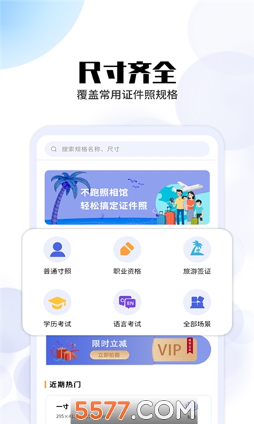 输入关键字,智能查找你所需的规格尺寸;一寸照、二寸照、学生证件照、考试证件照、工作证件照……海量尺寸,规格完备,是你拍摄证件照的优选