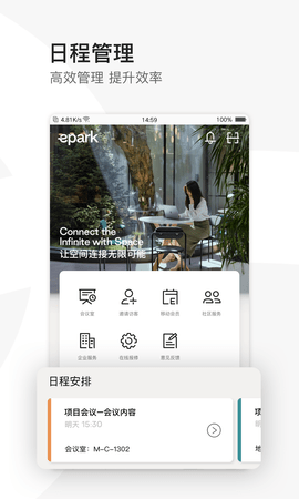 epark不仅有丰富多样的社群活动,能帮你提升工作能力、寻找职场默契,还具备智能投影功能,方便你和团队成员更好地分享工作内容与创意。此外,它还提供会议室预订服务,让协同工作更高效。不管是日常工作还是职场生活,epark都能为你提供全方位办公支持,助力你的工作更高效顺畅。