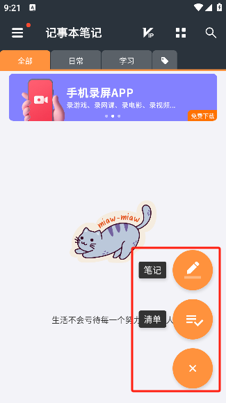 2.点击右下角+号,可以新建笔记和清单