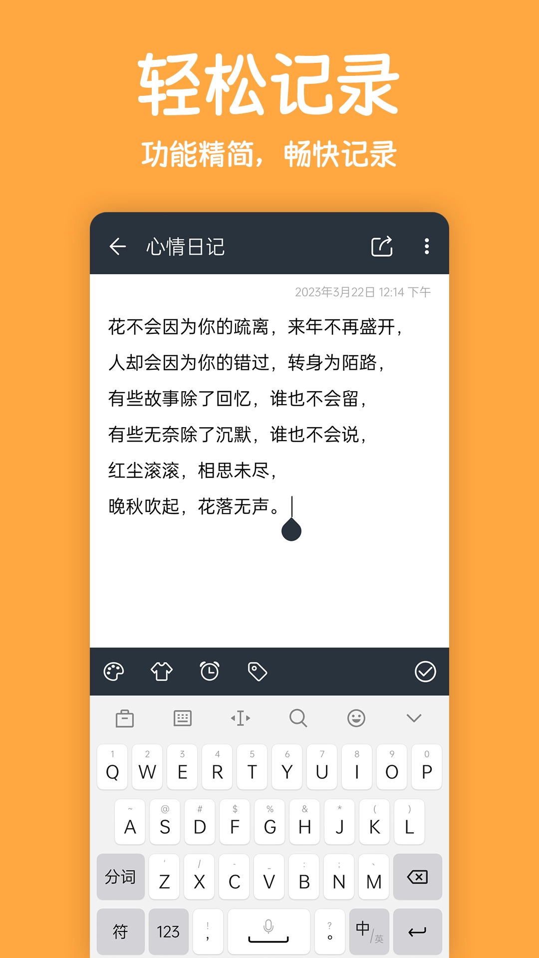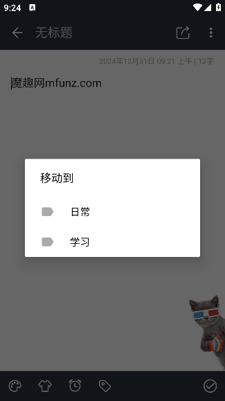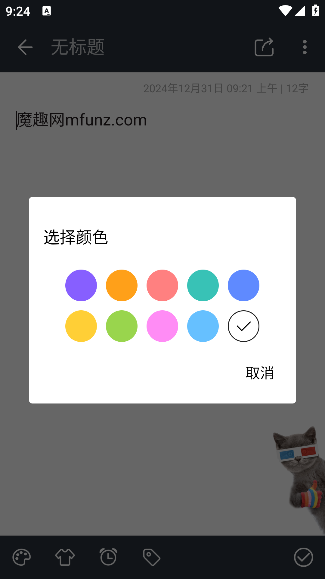 3.输入文字后点击右下角的对勾即可完成操作,也可以通过点击右上角的分享按钮来分享内容;左下角的功能区支持更改背景颜色、添加贴纸,还能进行定时编辑以及将内容移动到其他目录。