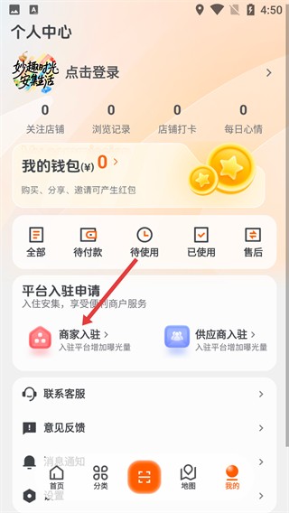 2、在个人中心页面,找到【商家入驻】选项,该选项可申请入驻平台,获取商家相关的服务权限。