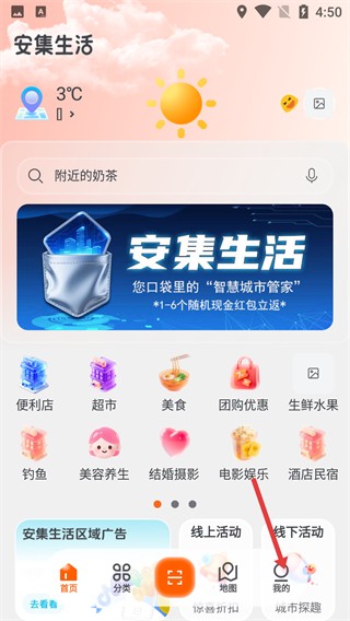 1、进入【安集生活】首页,浏览【便利店】-【美食】等服务入口,点击底部【我的】按钮,进入个人中心页面。