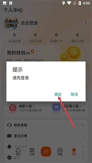 3、点击【商家入驻】后弹出【请先登录】提示框,点击【确定】按钮,进入账号登录的操作页面。