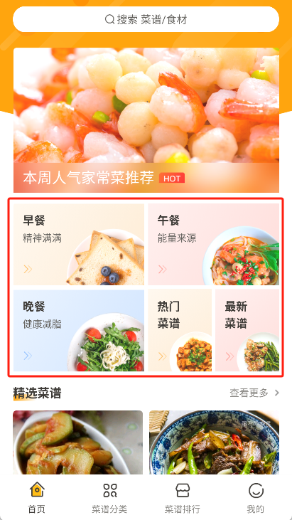 1、在软件首页看到早餐、午餐、晚餐等各类选项,供我们学习参考。