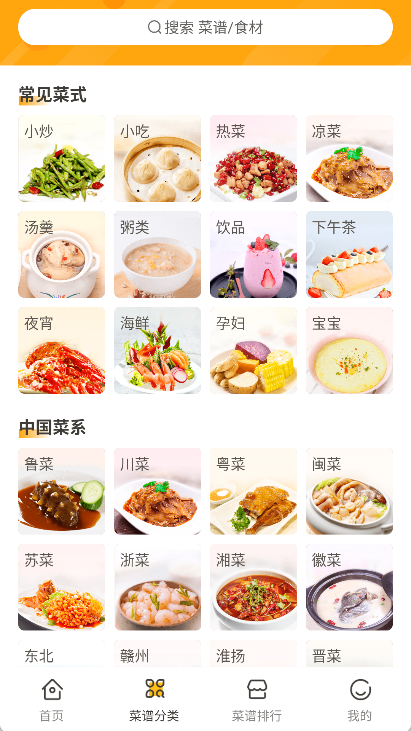 2、点击菜谱分类,我们可以探索常见菜式、中国各大菜系等丰富内容。