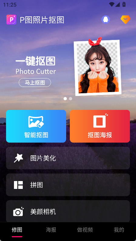 在主界面可以看到多个功能选项,例如【修图】页面里包含智能抠图、抠图海报、图片美化、拼图等功能。