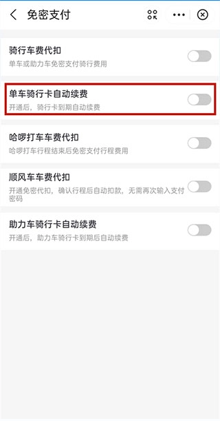 3、将单车骑行卡自动续费右侧按钮关闭即可。