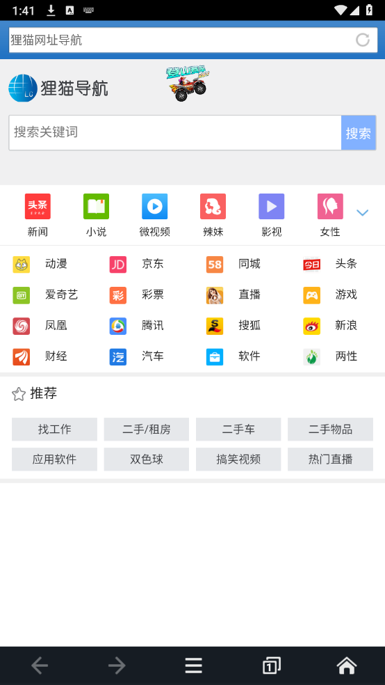 狸猫浏览器,英文名称leocatBrowser,便捷的搜索工具,具有体积小、搜索速度快且内容全面的特点受到了众多用户的欢迎,搜小说、新闻以及动漫等都是可以的,可以输入关键词或者网址进行搜索,将喜欢的网址进行收藏、分享、加入书签,弹窗,搜索更方便。
