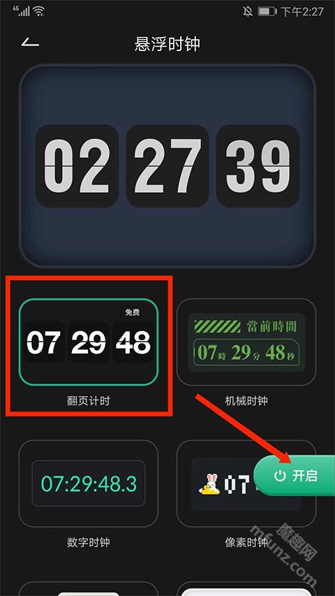 3、进入【悬浮时钟】界面后,找到【翻页时钟】选项并点击【开启】按钮