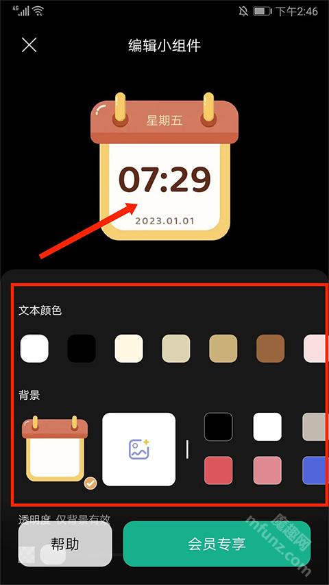 4、进入【编辑小组件】界面后,可对时间日期进行调整,并能自定义设置文本颜色与背景透明度。