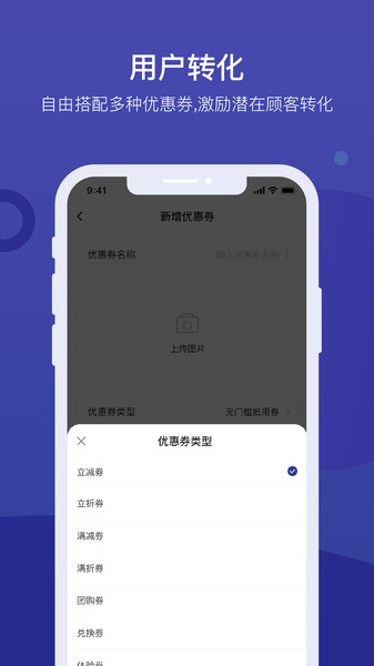 发放优惠券: 立减券、满减券、折扣券、满折券等多种类型的优惠券。