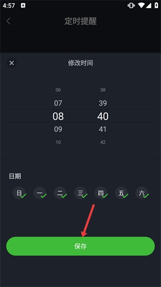 4、进入【修改时间】界面后,先设置好提醒的具体时刻以及重复的日期,接着点击界面底部的【保存】按钮,这样就完成了定时提醒的配置操作。