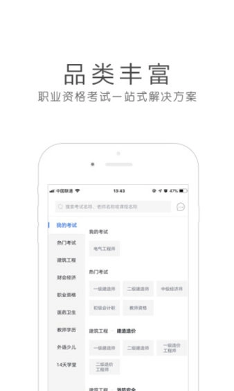 已涵盖建筑工程、财会经贸、职业资格、医药卫生、外语考试、教师公考、考研学历、IT技能等八大类超百个考试项目的在线录播与直播课程,其出版的教材教辅系列亦成为广大学员备考过程中不可或缺的重要资料。