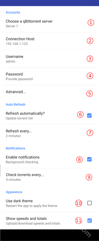 要开始使用这款应用程序,可从左侧菜单栏里选择“设置”选项,以此来配置qBittorrent服务器的相关选项以及账户信息。具体的设置内容如下: