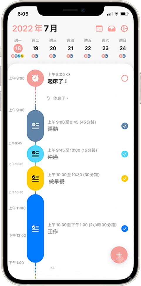 现在我们来添加新的待办事项或活动安排。请点击右下角的+按钮,输入事项或活动的名称,接着设置时间和行程时长。你可以自定义标签的颜色,要是你已经付费解锁了相关功能,还能为固定行程设置自动重复的选项。